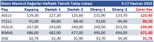 3-17 Haziran 2025 dönemi için teknik takip listemizde ASELS, TCELL, PGSUS, BIMAS ve SISE yer almaktadır.