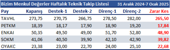 31 Aralık 2024-7 Ocak 2025 dönemi için teknik takip listemizde TAVHL, PETKM, ENKAI, SOKM ve OYAKC yer almaktadır.