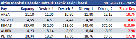 30 Eylül-7 Ekim 2025 dönemi için teknik takip listemizde AKSA, SNGYO, BIMAS, ALBRK ve