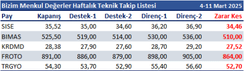 4-11 Mart 2025 dönemi için teknik takip listemizde SISE, BIMAS, KRDMD, FROTO ve TRGYO yer almaktadır.