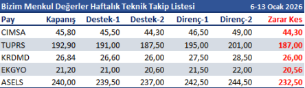 6-13 Ocak 2026 dönemi için teknik takip listemizde CIMSA, TUPRS, KRDMD, EKGYO ve ASELS yer almaktadır.