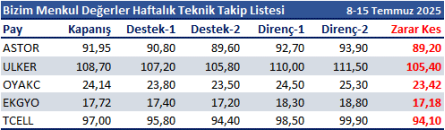 8-15 Temmuz 2025 dönemi için teknik takip listemizde ASTOR, ULKER, OYAKC, EKGYO ve TCELL yer almaktadır.