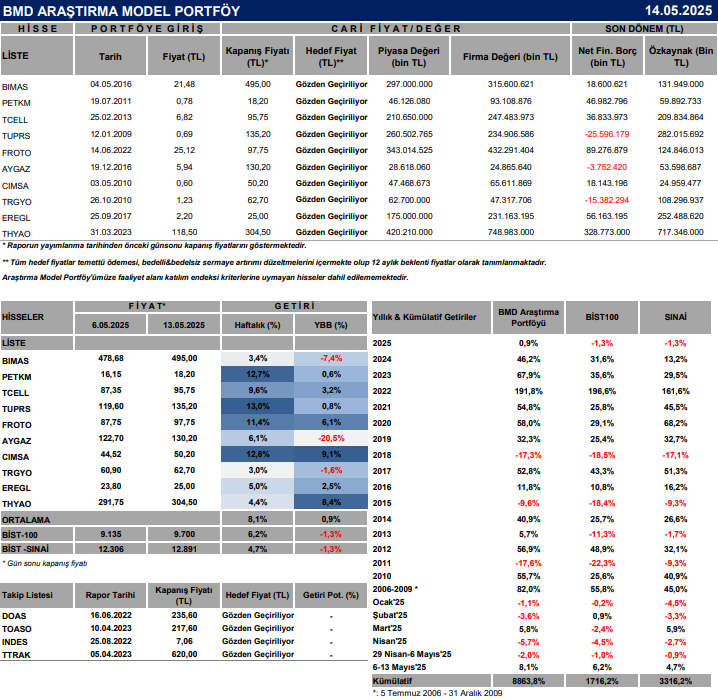 BMD Araştırma portföyünde BIMAS, PETKM, TCELL, TUPRS, FROTO, AYGAZ, CIMSA, TRGYO, THYAO ve EREGL yer almaktadır. 6-13 Mayıs 2025 döneminde BMD Araştırma Portföyü %8,1 değer kazanırken SINAİ Endeks %4,7 değer kazandı. Araştırma Portföyünde geçtiğimiz hafta en yüksek getiriyi %13,0 ile TUPRS sağlarken, en düşük getiriyi %3,0 ile TRGYO elde etmiştir. Yılbaşından bu yana BMD Araştırma Portföyü %0,9 değer kazanmış olup aynı dönemde SINAİ Endeks %1,3 değer kaybetmiştir.