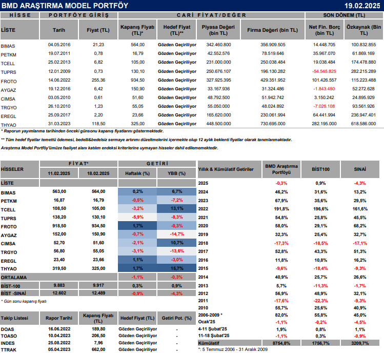 Bizim Menkul Model Portföy Tabloları – (19.02.2025)