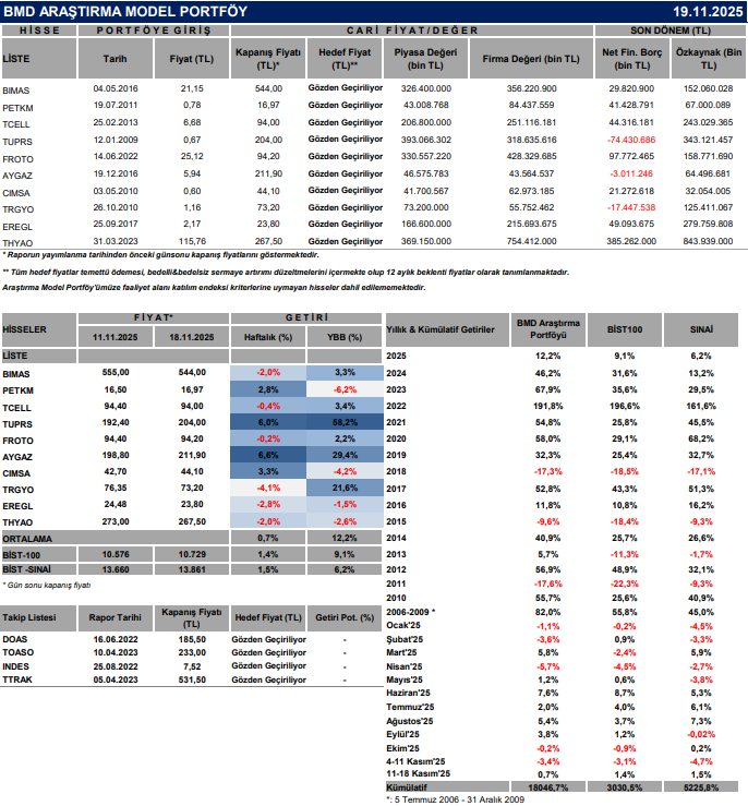 BMD Araştırma portföyünde BIMAS, PETKM, TCELL, TUPRS, FROTO, AYGAZ, CIMSA, TRGYO, THYAO ve EREGL yer almaktadır. 11-18 Kasım 2025 döneminde BMD Araştırma Portföyü %0,7 değer kazanırken SINAİ Endeks %1,5 değer kazandı. Araştırma Portföyünde geçtiğimiz hafta en yüksek getiri %6,6 ile AYGAZ sağlarken, en düşük getiriyi -%4,1 ile TRGYO elde etmiştir. Yılbaşından bu yana BMD Araştırma Portföyü %12,2 değer kazanmış olup aynı dönemde SINAİ Endeks %6,2 değer kazanmıştır.