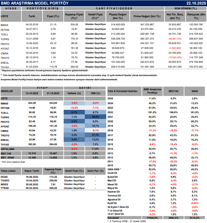 BMD Araştırma portföyünde BIMAS, PETKM, TCELL, TUPRS, FROTO, AYGAZ, CIMSA, TRGYO, THYAO ve EREGL yer almaktadır. 14-21 Ekim 2025 döneminde BMD Araştırma Portföyü %0,2 değer kaybederken SINAİ Endeks %1,5 değer kazandı. Araştırma Portföyünde geçtiğimiz hafta en yüksek getiri %6,7 ile TCELL sağlarken, en düşük getiriyi -%15,5 ile PETKM elde etmiştir. Yılbaşından bu yana BMD Araştırma Portföyü %11,6 değer kazanmış olup aynı dönemde SINAİ Endeks %3,9 değer kazanmıştır.