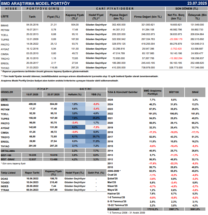 BMD Araştırma portföyünde BIMAS, PETKM, TCELL, TUPRS, FROTO, AYGAZ, CIMSA, TRGYO, THYAO ve EREGL yer almaktadır. 15-22 Temmuz 2025 döneminde BMD Araştırma Portföyü %2,2 değer kazanırken SINAİ Endeks %4,2 değer kazandı. Araştırma Portföyünde geçtiğimiz hafta en yüksek getiriyi %7,8 ile TUPRS sağlarken, en düşük getiriyi -%3,0 ile CIMSA elde etmiştir. Yılbaşından bu yana BMD Araştırma Portföyü %7,7 değer kazanmış olup aynı dönemde SINAİ Endeks %3,3 değer kazanmıştır.
