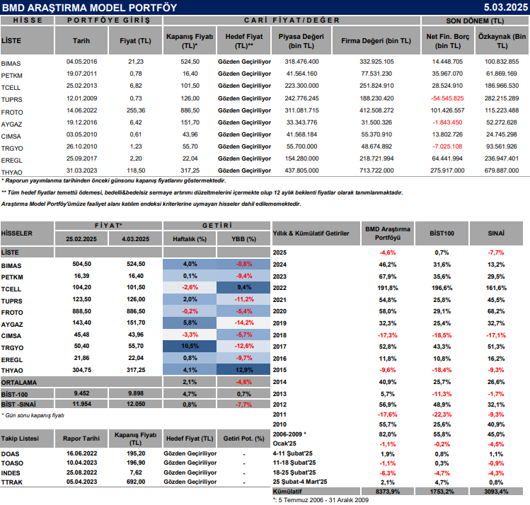 BMD Araştırma portföyünde BIMAS, PETKM, TCELL, TUPRS, FROTO, AYGAZ, CIMSA, TRGYO, THYAO ve EREGL yer almaktadır. 25 Şubat- 4 Mart 2025 döneminde BMD Araştırma Portföyü %2,1 değer kazanırken SINAİ Endeks %0,8 değer kazandı. Araştırma Portföyünde geçtiğimiz hafta en yüksek getiriyi %10,5 ile TRGYO sağlarken, en düşük getiriyi -%3,3 ile CIMSA elde etmiştir. Yılbaşından bu yana BMD Araştırma Portföyü %4,6 değer kaybetmiş olup aynı dönemde SINAİ Endeks de %7,7 değer kaybetmiştir.