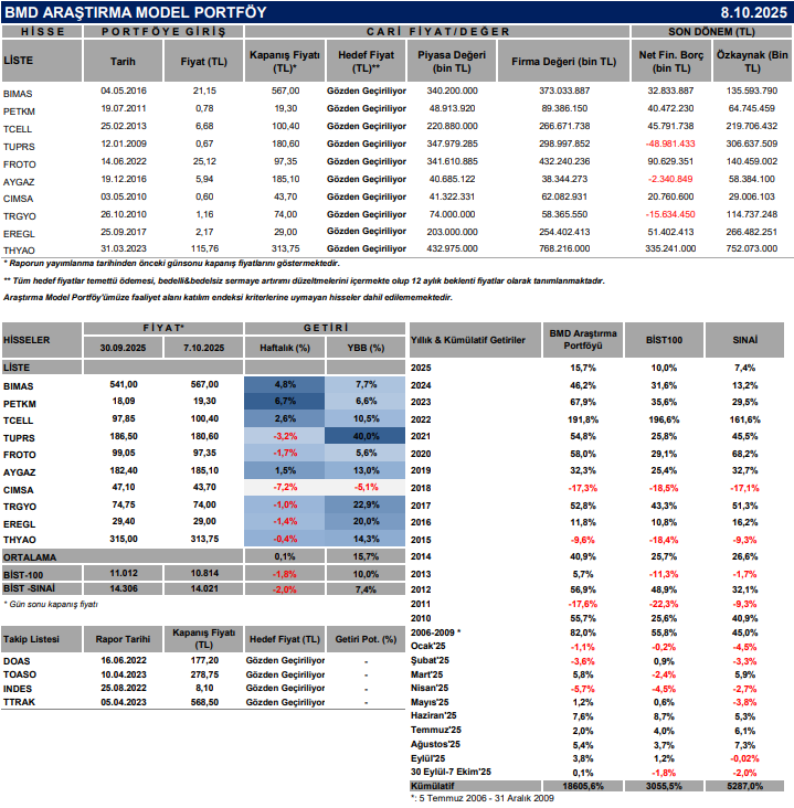 BMD Araştırma portföyünde BIMAS, PETKM, TCELL, TUPRS, FROTO, AYGAZ, CIMSA, TRGYO, THYAO ve EREGL yer almaktadır. 30 Eylül-7 Ekim 2025 döneminde BMD Araştırma Portföyü %0,1 değer kazanırken SINAİ Endeks %2,0 değer kaybetti. Araştırma Portföyünde geçtiğimiz hafta en yüksek getiri %6,7 ile PETKM sağlarken, en düşük getiriyi -%7,2 ile CIMSA elde etmiştir. Yılbaşından bu yana BMD Araştırma Portföyü %15,7 değer kazanmış olup aynı dönemde SINAİ Endeks %7,4 değer kazanmıştır.