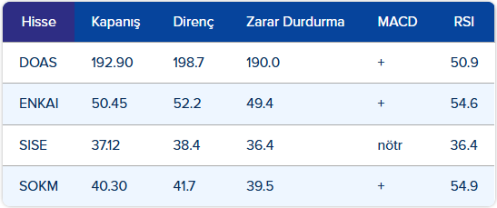 • Endeksin hâlâ kısa vadeli hareketli ortalamaların altında seyretmesi, teknik görünümün zayıf kalmasına neden oluyor. Endekste 10.000 puanlık psikolojik eşik aşılana kadar 9.900 – 9.950 bölgesi önemli bir direnç alanı oluşturmaya devam ediyor. Bu bölgenin kırılması ve üzerinde kalıcılık sağlanması hâlinde iyimserlik artabilir. Ancak bu seviyeler geçilmeden temkinli iyimserlik korunuyor.