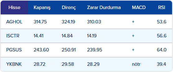 • Kısa vadeli ortalamaların altında seyir devam ediyor. Yukarıda kritik direnç seviyesi 9.970 puan olarak öne çıkıyor. Önemli destek seviyeleri 9.765 ve 9.570 puan olup, bu seviyelerin altına sarkılması durumunda temkinli olunması gerektiğini düşünmekteyiz. Teknik bakımdan haftalık görünümde, 5 haftalık ortalama olan 9.910 seviyesinin üzerinde kapanışlara ihtiyaç duyuluyor.