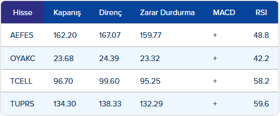 • Bugün yukarı yönlü hareketin devamı açısından izlenmesi gereken kritik teknik seviye olarak 9.675 puan seviyesini takip etmekteyiz. Bu seviyenin üzerinde gerçekleşecek bir günlük kapanış, kısa vadede yükseliş eğiliminin teyidi olarak değerlendirilebilir. Ancak, geçen hafta üç kez deneyip geçemediğimiz 9.775 seviyesi hâlâ önemini korumaktadır. Kısa vadede takip ettiğimiz 5 ve 8 günlük ortalamaların üzerinde bulunuyoruz. Olası geri çekilmelerde 9.600 ve 9.550 seviyelerinde bulunan bu ortalamaları teknik destekler olarak izlemeye devam edeceğiz.
