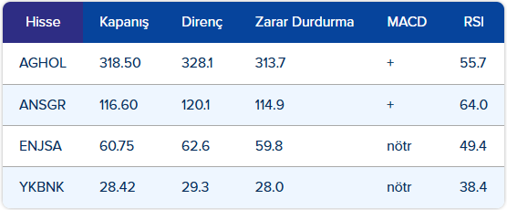 • Teknik görünüme baktığımızda gün içi geri çekilmelerde 9.750 – 9.700 – 9.650 puan seviyelerini takip edeceğiz. Yukarı hareketlerde ise sırasıyla 9.850 – 9.910 – 9.970 direnç seviyeleri olarak izlenebilir.