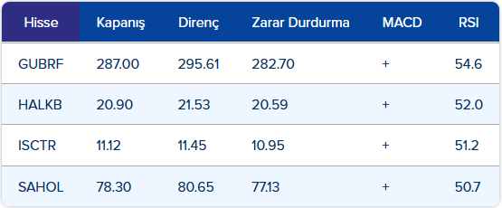 • Endekste gün içi geri çekilmelerde 9.450 – 9.400 – 9.350 puan seviyelerini takip edeceğiz. Yukarı hareketlerde ise sırasıyla 9.500 – 9.550 – 9.600 direnç seviyeleri olarak izlenebilir.
