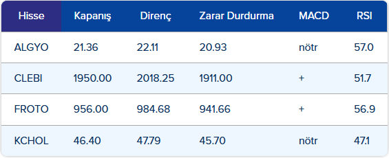 • Teknik görünüme baktığımızda gün içi geri çekilmelerde 10.075 – 10.040 – 10.000 puan seviyelerini takip edeceğiz. Yukarı hareketlerde ise sırasıyla 10.160 – 10.190 – 10.270 direnç seviyeleri olarak izlenebilir.