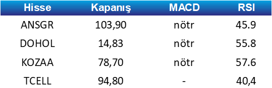 • Endekste ilk önemli direnç seviyesi, 9.835 puanda bulunan 8 günlük üssel hareketli ortalama olarak öne çıkıyor. Bunun hemen üzerinde ise, Fibonacci %50 düzeltme seviyesi olan 9.875 puan, ikinci önemli direnç olarak takip ediliyor. Yukarı yönlü hareketin devamı açısından, 9.535 seviyesi üzerinde kalıcılık sağlanması kritik önem taşıyor.