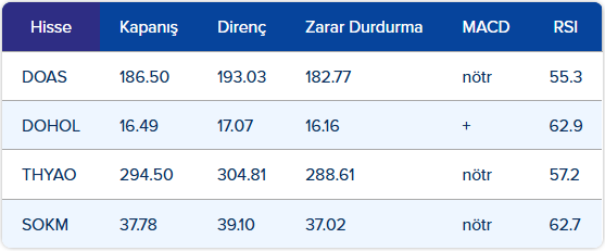 • Endekste yön tayini açısından kritik bir eşikteyiz. Bundan sonraki süreçte 10.900 puan üzeri ya da 10.790 puan altı seviyelerin aşılması, kısa vadeli yönün belirlenmesinde etkili olabileceğini düşünmekteyiz. Bu seviyelerden hangisi geçilirse, hareketin o yönde ivmelenmesi beklenebilir. Teknik görünümde 5 ve 8 günlük üssel hareketli ortalamalar, iz süren stop seviyeleri olarak önemini koruyor. Bugün için bu ortalamalar sırasıyla 10.729 ve 10.673 puan seviyelerinde bulunuyor.