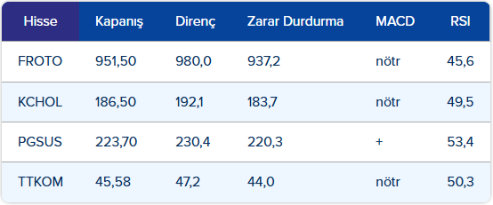 • Endeksi teknik açıdan değerlendirdiğimizde, kısa vadeli direnç olarak takip ettiğimiz 10,055 seviyesinin üzerinde kapanış yapılmasını olumlu olarak değerlendirmekteyiz. Bu seviyenin korunmasıyla pozitif görünüm devam edebilir, 10,150-10,270 direnç seviyeleri hedeflenebilir. Sonraki önemli seviye olarak 10,415 direnç bölgesi izlenebilir.