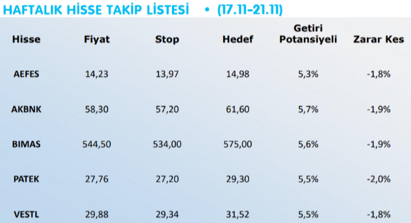 BIST100 endeksi geçtiğimiz haftayı %3,3 düşüşle 10565 puandan tamamladı. Hafta içinde 10373 seviyesine kadar geri çekilen endekste tepki alışları ile kayıplar sınırlandı. Yeniden uzun vadeli ortalamalarına çekilen endekste destek alışları kalıcı olamıyor. Geçtiğimiz haftaki negatif başlıkların geride kalmasının ardından yeni haftada endekste kısmi rahatlama olabilir. Yeniden değerleme oranının hedef enflasyona göre revize edilmesi, güçlü gelen bilançoların piyasaya destek vermesi, kasım ayı TÜFE’ye ilişkin düşük öncü beklentiler bu hafta piyasaya destek verebilir.