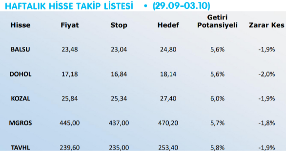 BIST100 endeksi geçtiğimiz haftayı %1,27 düşüşle 11151 puandan tamamladı. Haftaya pozitif haber akışları ile 11533 seviyesinden başlayan endekste haftanın açılışı en yüksek seviye oldu ve 5 gün boyunca satıcılı seyir devam etti. Kapanışı da haftanın en düşük seviyelerine yakın noktadan gerçekleşti. Yeni haftada piyasalar cuma günü gelecek eylül enflasyonuna odaklanacak. %2,5 aylık artış beklenirken, buna paralel ve üzeri rakamlar risk iştahını baskılayabilir. 1 ekim çarşamba günü İstanbul enflasyonu öncü data olarak önem arz ediyor.