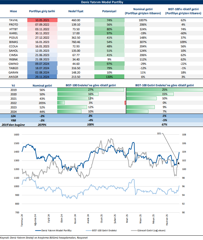 Deniz Yatırım Model Portföy, Deniz Yatırım Strateji ve Araştırma Bölümü tarafından, temel analiz kriterlerine göre hazırlanmış, orta-uzun vadeli hisse senedi tavsiye listesidir. Alınan pozisyonlar sadece uzun yönlüdür (long only). Herhangi bir rakamsal/yüzdesel getiri hedefi söz konusu değildir. Herhangi bir şirket sayısı sınırı söz konusu değildir. Herhangi bir sıklıkta/takvim dahilinde değişiklik yapma zorunluluğu söz konusu değildir. Strateji ve Araştırma Bölümü analistleri portföyü takvim yılı içerisinde piyasa koşulları izin vermez ise değiştirmeme hakkına sahiptirler. Portföy içerisinde yer alan şirketler için temel analiz açısından getiri potansiyeli kalmamış dahi olsa da (değerleme olarak) şirket markasına olan geçmiş ve gelecek dönem güveni ile liste içerisinde kalmaya devam edebilirler. Portföyde yer alan şirketler için AL tavsiyesi bulunması zorunluluğu söz konusu değildir. Bölüm analistleri, TUT ve/veya Gözden Geçiriliyor önerileri ile de liste içerisinde şirket tercihinde bulunabilirler.