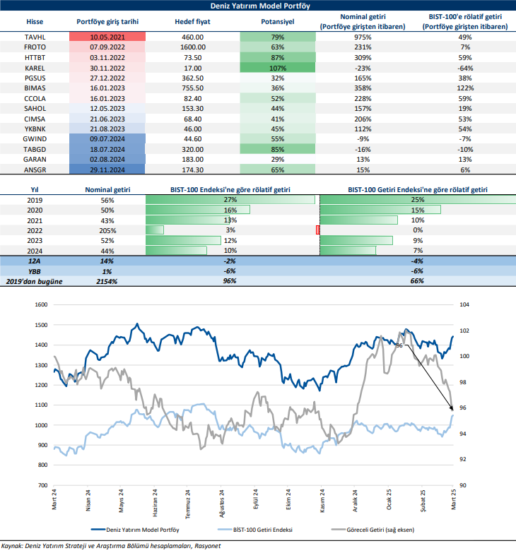 Deniz Yatırım Model Portföy, Deniz Yatırım Strateji ve Araştırma Bölümü tarafından, temel analiz kriterlerine göre hazırlanmış, orta-uzun vadeli hisse senedi tavsiye listesidir. Alınan pozisyonlar sadece uzun yönlüdür (long only). Herhangi bir rakamsal/yüzdesel getiri hedefi söz konusu değildir. Herhangi bir şirket sayısı sınırı söz konusu değildir. Herhangi bir sıklıkta/takvim dahilinde değişiklik yapma zorunluluğu söz konusu değildir. Strateji ve Araştırma Bölümü analistleri portföyü takvim yılı içerisinde piyasa koşulları izin vermez ise değiştirmeme hakkına sahiptirler. Portföy içerisinde yer alan şirketler için temel analiz açısından getiri potansiyeli kalmamış dahi olsa da (değerleme olarak) şirket markasına olan geçmiş ve gelecek dönem güveni ile liste içerisinde kalmaya devam edebilirler. Portföyde yer alan şirketler için AL tavsiyesi bulunması zorunluluğu söz konusu değildir. Bölüm analistleri, TUT ve/veya Gözden Geçiriliyor önerileri ile de liste içerisinde şirket tercihinde bulunabilirler.