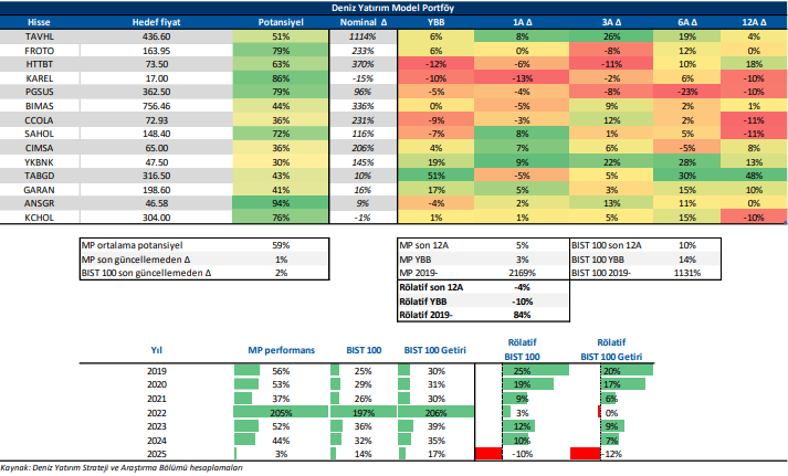 Deniz Yatırım Model Portföy, Deniz Yatırım Strateji ve Araştırma Bölümü tarafından, temel analiz kriterlerine göre hazırlanmış, orta-uzun vadeli hisse senedi tavsiye listesidir. Alınan pozisyonlar sadece uzun yönlüdür (long only). Herhangi bir rakamsal/yüzdesel getiri hedefi söz konusu değildir. Herhangi bir şirket sayısı sınırı söz konusu değildir. Herhangi bir sıklıkta/takvim dahilinde değişiklik yapma zorunluluğu söz konusu değildir. Strateji ve Araştırma Bölümü analistleri portföyü takvim yılı içerisinde piyasa koşulları izin vermez ise değiştirmeme hakkına sahiptirler. Portföy içerisinde yer alan şirketler için temel analiz açısından getiri potansiyeli kalmamış dahi olsa da (değerleme olarak) şirket markasına olan geçmiş ve gelecek dönem güveni ile liste içerisinde kalmaya devam edebilirler. Portföyde yer alan şirketler için AL tavsiyesi bulunması zorunluluğu söz konusu değildir. Bölüm analistleri, TUT ve/veya Gözden Geçiriliyor önerileri ile de liste içerisinde şirket tercihinde bulunabilirler.