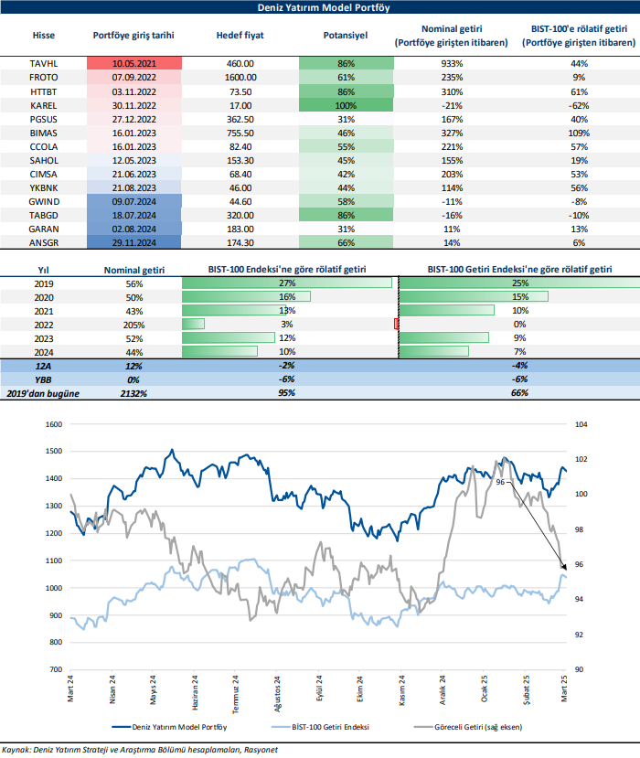Deniz Yatırım Model Portföy, Deniz Yatırım Strateji ve Araştırma Bölümü tarafından, temel analiz kriterlerine göre hazırlanmış, orta-uzun vadeli hisse senedi tavsiye listesidir. Alınan pozisyonlar sadece uzun yönlüdür (long only). Herhangi bir rakamsal/yüzdesel getiri hedefi söz konusu değildir. Herhangi bir şirket sayısı sınırı söz konusu değildir. Herhangi bir sıklıkta/takvim dahilinde değişiklik yapma zorunluluğu söz konusu değildir. Strateji ve Araştırma Bölümü analistleri portföyü takvim yılı içerisinde piyasa koşulları izin vermez ise değiştirmeme hakkına sahiptirler. Portföy içerisinde yer alan şirketler için temel analiz açısından getiri potansiyeli kalmamış dahi olsa da (değerleme olarak) şirket markasına olan geçmiş ve gelecek dönem güveni ile liste içerisinde kalmaya devam edebilirler. Portföyde yer alan şirketler için AL tavsiyesi bulunması zorunluluğu söz konusu değildir. Bölüm analistleri, TUT ve/veya Gözden Geçiriliyor önerileri ile de liste içerisinde şirket tercihinde bulunabilirler.