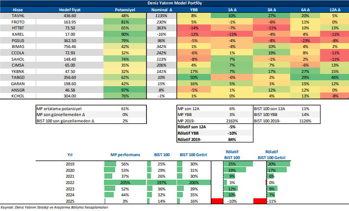 Deniz Yatırım Model Portföy, Deniz Yatırım Strateji ve Araştırma Bölümü tarafından, temel analiz kriterlerine göre hazırlanmış, orta-uzun vadeli hisse senedi tavsiye listesidir. Alınan pozisyonlar sadece uzun yönlüdür (long only). Herhangi bir rakamsal/yüzdesel getiri hedefi söz konusu değildir. Herhangi bir şirket sayısı sınırı söz konusu değildir. Herhangi bir sıklıkta/takvim dahilinde değişiklik yapma zorunluluğu söz konusu değildir. Strateji ve Araştırma Bölümü analistleri portföyü takvim yılı içerisinde piyasa koşulları izin vermez ise değiştirmeme hakkına sahiptirler. Portföy içerisinde yer alan şirketler için temel analiz açısından getiri potansiyeli kalmamış dahi olsa da (değerleme olarak) şirket markasına olan geçmiş ve gelecek dönem güveni ile liste içerisinde kalmaya devam edebilirler. Portföyde yer alan şirketler için AL tavsiyesi bulunması zorunluluğu söz konusu değildir. Bölüm analistleri, TUT ve/veya Gözden Geçiriliyor önerileri ile de liste içerisinde şirket tercihinde bulunabilirler.