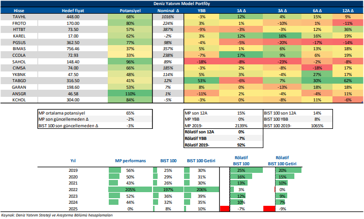 Deniz Yatırım Model Portföy, Deniz Yatırım Strateji ve Araştırma Bölümü tarafından, temel analiz kriterlerine göre hazırlanmış, orta-uzun vadeli hisse senedi tavsiye listesidir. Alınan pozisyonlar sadece uzun yönlüdür (long only). Herhangi bir rakamsal/yüzdesel getiri hedefi söz konusu değildir. Herhangi bir şirket sayısı sınırı söz konusu değildir. Herhangi bir sıklıkta/takvim dahilinde değişiklik yapma zorunluluğu söz konusu değildir. Strateji ve Araştırma Bölümü analistleri portföyü takvim yılı içerisinde piyasa koşulları izin vermez ise değiştirmeme hakkına sahiptirler. Portföy içerisinde yer alan şirketler için temel analiz açısından getiri potansiyeli kalmamış dahi olsa da (değerleme olarak) şirket markasına olan geçmiş ve gelecek dönem güveni ile liste içerisinde kalmaya devam edebilirler. Portföyde yer alan şirketler için AL tavsiyesi bulunması zorunluluğu söz konusu değildir. Bölüm analistleri, TUT ve/veya Gözden Geçiriliyor önerileri ile de liste içerisinde şirket tercihinde bulunabilirler.