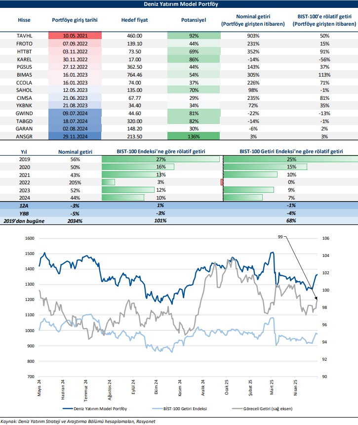 Deniz Yatırım Model Portföy, Deniz Yatırım Strateji ve Araştırma Bölümü tarafından, temel analiz kriterlerine göre hazırlanmış, orta-uzun vadeli hisse senedi tavsiye listesidir. Alınan pozisyonlar sadece uzun yönlüdür (long only). Herhangi bir rakamsal/yüzdesel getiri hedefi söz konusu değildir. Herhangi bir şirket sayısı sınırı söz konusu değildir. Herhangi bir sıklıkta/takvim dahilinde değişiklik yapma zorunluluğu söz konusu değildir. Strateji ve Araştırma Bölümü analistleri portföyü takvim yılı içerisinde piyasa koşulları izin vermez ise değiştirmeme hakkına sahiptirler. Portföy içerisinde yer alan şirketler için temel analiz açısından getiri potansiyeli kalmamış dahi olsa da (değerleme olarak) şirket markasına olan geçmiş ve gelecek dönem güveni ile liste içerisinde kalmaya devam edebilirler. Portföyde yer alan şirketler için AL tavsiyesi bulunması zorunluluğu söz konusu değildir. Bölüm analistleri, TUT ve/veya Gözden Geçiriliyor önerileri ile de liste içerisinde şirket tercihinde bulunabilirler.