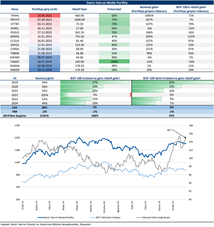 Deniz Yatırım Model Portföy, Deniz Yatırım Strateji ve Araştırma Bölümü tarafından, temel analiz kriterlerine göre hazırlanmış, orta-uzun vadeli hisse senedi tavsiye listesidir. Alınan pozisyonlar sadece uzun yönlüdür (long only). Herhangi bir rakamsal/yüzdesel getiri hedefi söz konusu değildir. Herhangi bir şirket sayısı sınırı söz konusu değildir. Herhangi bir sıklıkta/takvim dahilinde değişiklik yapma zorunluluğu söz konusu değildir. Strateji ve Araştırma Bölümü analistleri portföyü takvim yılı içerisinde piyasa koşulları izin vermez ise değiştirmeme hakkına sahiptirler. Portföy içerisinde yer alan şirketler için temel analiz açısından getiri potansiyeli kalmamış dahi olsa da (değerleme olarak) şirket markasına olan geçmiş ve gelecek dönem güveni ile liste içerisinde kalmaya devam edebilirler. Portföyde yer alan şirketler için AL tavsiyesi bulunması zorunluluğu söz konusu değildir. Bölüm analistleri, TUT ve/veya Gözden Geçiriliyor önerileri ile de liste içerisinde şirket tercihinde bulunabilirler.