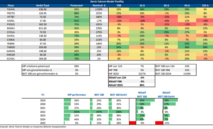 Deniz Yatırım Model Portföy, Deniz Yatırım Strateji ve Araştırma Bölümü tarafından, temel analiz kriterlerine göre hazırlanmış, orta-uzun vadeli hisse senedi tavsiye listesidir. Alınan pozisyonlar sadece uzun yönlüdür (long only). Herhangi bir rakamsal/yüzdesel getiri hedefi söz konusu değildir. Herhangi bir şirket sayısı sınırı söz konusu değildir. Herhangi bir sıklıkta/takvim dahilinde değişiklik yapma zorunluluğu söz konusu değildir. Strateji ve Araştırma Bölümü analistleri portföyü takvim yılı içerisinde piyasa koşulları izin vermez ise değiştirmeme hakkına sahiptirler. Portföy içerisinde yer alan şirketler için temel analiz açısından getiri potansiyeli kalmamış dahi olsa da (değerleme olarak) şirket markasına olan geçmiş ve gelecek dönem güveni ile liste içerisinde kalmaya devam edebilirler. Portföyde yer alan şirketler için AL tavsiyesi bulunması zorunluluğu söz konusu değildir. Bölüm analistleri, TUT ve/veya Gözden Geçiriliyor önerileri ile de liste içerisinde şirket tercihinde bulunabilirler.