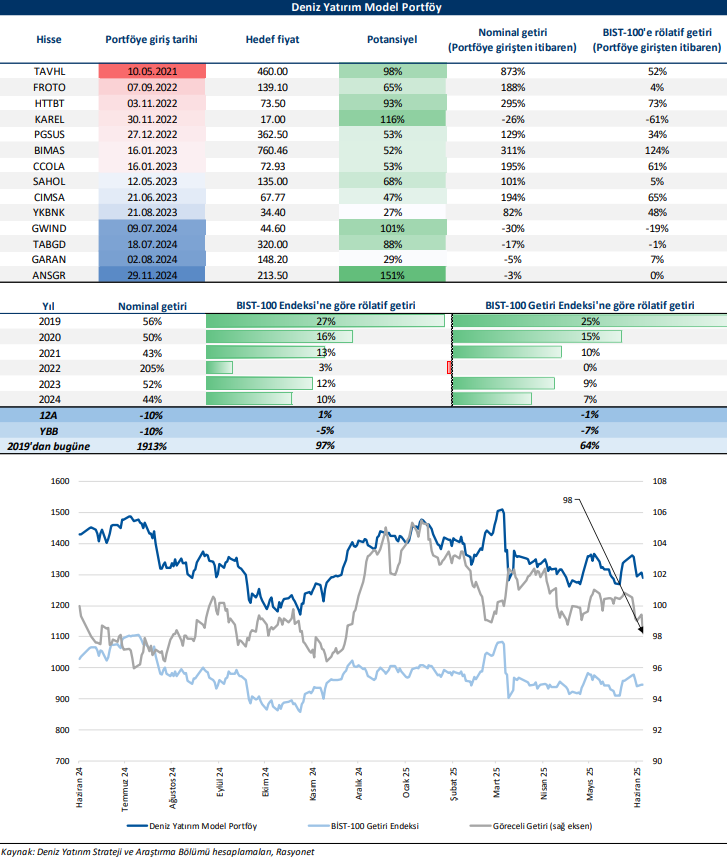 Deniz Yatırım Model Portföy, Deniz Yatırım Strateji ve Araştırma Bölümü tarafından, temel analiz kriterlerine göre hazırlanmış, orta-uzun vadeli hisse senedi tavsiye listesidir. Alınan pozisyonlar sadece uzun yönlüdür (long only). Herhangi bir rakamsal/yüzdesel getiri hedefi söz konusu değildir. Herhangi bir şirket sayısı sınırı söz konusu değildir. Herhangi bir sıklıkta/takvim dahilinde değişiklik yapma zorunluluğu söz konusu değildir. Strateji ve Araştırma Bölümü analistleri portföyü takvim yılı içerisinde piyasa koşulları izin vermez ise değiştirmeme hakkına sahiptirler. Portföy içerisinde yer alan şirketler için temel analiz açısından getiri potansiyeli kalmamış dahi olsa da (değerleme olarak) şirket markasına olan geçmiş ve gelecek dönem güveni ile liste içerisinde kalmaya devam edebilirler. Portföyde yer alan şirketler için AL tavsiyesi bulunması zorunluluğu söz konusu değildir. Bölüm analistleri, TUT ve/veya Gözden Geçiriliyor önerileri ile de liste içerisinde şirket tercihinde bulunabilirler.