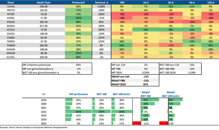 Deniz Yatırım Model Portföy, Deniz Yatırım Strateji ve Araştırma Bölümü tarafından, temel analiz kriterlerine göre hazırlanmış, orta-uzun vadeli hisse senedi tavsiye listesidir. Alınan pozisyonlar sadece uzun yönlüdür (long only). Herhangi bir rakamsal/yüzdesel getiri hedefi söz konusu değildir. Herhangi bir şirket sayısı sınırı söz konusu değildir. Herhangi bir sıklıkta/takvim dahilinde değişiklik yapma zorunluluğu söz konusu değildir. Strateji ve Araştırma Bölümü analistleri portföyü takvim yılı içerisinde piyasa koşulları izin vermez ise değiştirmeme hakkına sahiptirler. Portföy içerisinde yer alan şirketler için temel analiz açısından getiri potansiyeli kalmamış dahi olsa da (değerleme olarak) şirket markasına olan geçmiş ve gelecek dönem güveni ile liste içerisinde kalmaya devam edebilirler. Portföyde yer alan şirketler için AL tavsiyesi bulunması zorunluluğu söz konusu değildir. Bölüm analistleri, TUT ve/veya Gözden Geçiriliyor önerileri ile de liste içerisinde şirket tercihinde bulunabilirler.