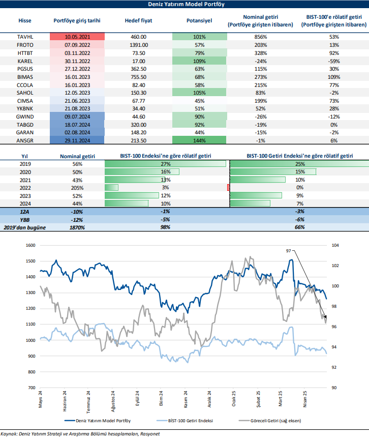 Deniz Yatırım Model Portföy, Deniz Yatırım Strateji ve Araştırma Bölümü tarafından, temel analiz kriterlerine göre hazırlanmış, orta-uzun vadeli hisse senedi tavsiye listesidir. Alınan pozisyonlar sadece uzun yönlüdür (long only). Herhangi bir rakamsal/yüzdesel getiri hedefi söz konusu değildir. Herhangi bir şirket sayısı sınırı söz konusu değildir. Herhangi bir sıklıkta/takvim dahilinde değişiklik yapma zorunluluğu söz konusu değildir. Strateji ve Araştırma Bölümü analistleri portföyü takvim yılı içerisinde piyasa koşulları izin vermez ise değiştirmeme hakkına sahiptirler. Portföy içerisinde yer alan şirketler için temel analiz açısından getiri potansiyeli kalmamış dahi olsa da (değerleme olarak) şirket markasına olan geçmiş ve gelecek dönem güveni ile liste içerisinde kalmaya devam edebilirler. Portföyde yer alan şirketler için AL tavsiyesi bulunması zorunluluğu söz konusu değildir. Bölüm analistleri, TUT ve/veya Gözden Geçiriliyor önerileri ile de liste içerisinde şirket tercihinde bulunabilirler.