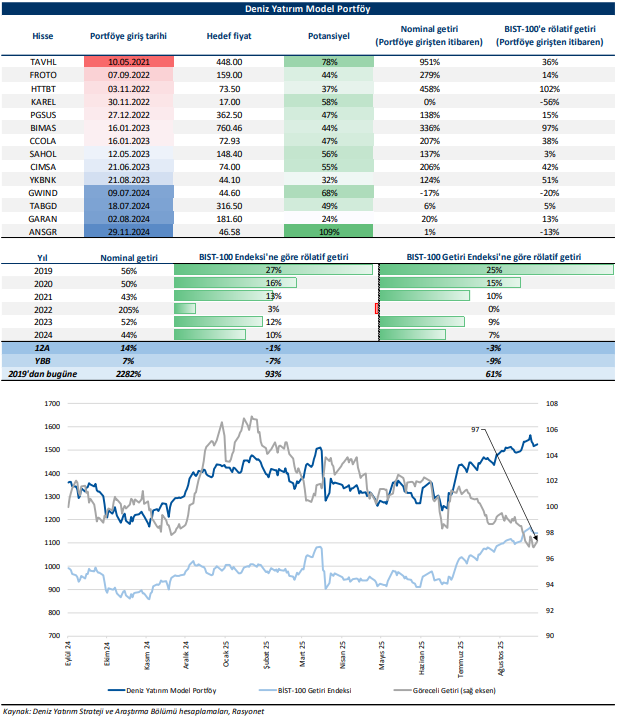 Deniz Yatırım Model Portföy, Deniz Yatırım Strateji ve Araştırma Bölümü tarafından, temel analiz kriterlerine göre hazırlanmış, orta-uzun vadeli hisse senedi tavsiye listesidir. Alınan pozisyonlar sadece uzun yönlüdür (long only). Herhangi bir rakamsal/yüzdesel getiri hedefi söz konusu değildir. Herhangi bir şirket sayısı sınırı söz konusu değildir. Herhangi bir sıklıkta/takvim dahilinde değişiklik yapma zorunluluğu söz konusu değildir. Strateji ve Araştırma Bölümü analistleri portföyü takvim yılı içerisinde piyasa koşulları izin vermez ise değiştirmeme hakkına sahiptirler. Portföy içerisinde yer alan şirketler için temel analiz açısından getiri potansiyeli kalmamış dahi olsa da (değerleme olarak) şirket markasına olan geçmiş ve gelecek dönem güveni ile liste içerisinde kalmaya devam edebilirler. Portföyde yer alan şirketler için AL tavsiyesi bulunması zorunluluğu söz konusu değildir. Bölüm analistleri, TUT ve/veya Gözden Geçiriliyor önerileri ile de liste içerisinde şirket tercihinde bulunabilirler.
