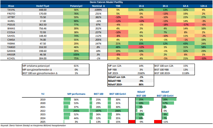Deniz Yatırım Model Portföy, Deniz Yatırım Strateji ve Araştırma Bölümü tarafından, temel analiz kriterlerine göre hazırlanmış, orta-uzun vadeli hisse senedi tavsiye listesidir. Alınan pozisyonlar sadece uzun yönlüdür (long only). Herhangi bir rakamsal/yüzdesel getiri hedefi söz konusu değildir. Herhangi bir şirket sayısı sınırı söz konusu değildir. Herhangi bir sıklıkta/takvim dahilinde değişiklik yapma zorunluluğu söz konusu değildir. Strateji ve Araştırma Bölümü analistleri portföyü takvim yılı içerisinde piyasa koşulları izin vermez ise değiştirmeme hakkına sahiptirler. Portföy içerisinde yer alan şirketler için temel analiz açısından getiri potansiyeli kalmamış dahi olsa da (değerleme olarak) şirket markasına olan geçmiş ve gelecek dönem güveni ile liste içerisinde kalmaya devam edebilirler. Portföyde yer alan şirketler için AL tavsiyesi bulunması zorunluluğu söz konusu değildir. Bölüm analistleri, TUT ve/veya Gözden Geçiriliyor önerileri ile de liste içerisinde şirket tercihinde bulunabilirler.