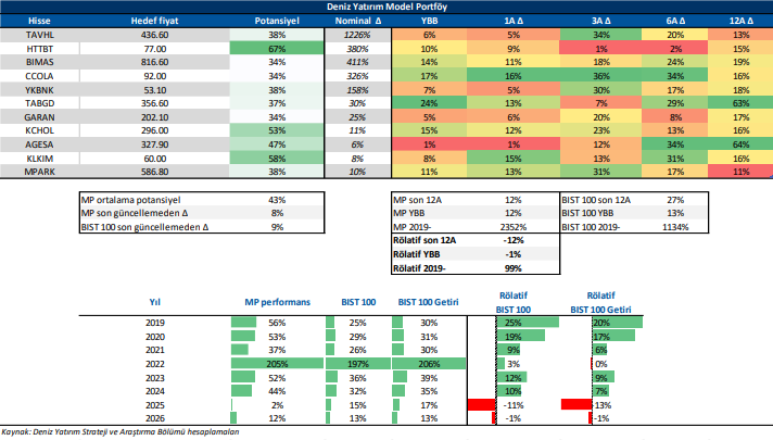 Deniz Yatırım Model Portföy, Deniz Yatırım Strateji ve Araştırma Bölümü tarafından, temel analiz kriterlerine göre hazırlanmış, orta-uzun vadeli hisse senedi tavsiye listesidir. Alınan pozisyonlar sadece uzun yönlüdür (long only). Herhangi bir rakamsal/yüzdesel getiri hedefi söz konusu değildir. Herhangi bir şirket sayısı sınırı söz konusu değildir. Herhangi bir sıklıkta/takvim dahilinde değişiklik yapma zorunluluğu söz konusu değildir. Strateji ve Araştırma Bölümü analistleri portföyü takvim yılı içerisinde piyasa koşulları izin vermez ise değiştirmeme hakkına sahiptirler. Portföy içerisinde yer alan şirketler için temel analiz açısından getiri potansiyeli kalmamış dahi olsa da (değerleme olarak) şirket markasına olan geçmiş ve gelecek dönem güveni ile liste içerisinde kalmaya devam edebilirler. Portföyde yer alan şirketler için AL tavsiyesi bulunması zorunluluğu söz konusu değildir. Bölüm analistleri, TUT ve/veya Gözden Geçiriliyor önerileri ile de liste içerisinde şirket tercihinde bulunabilirler.