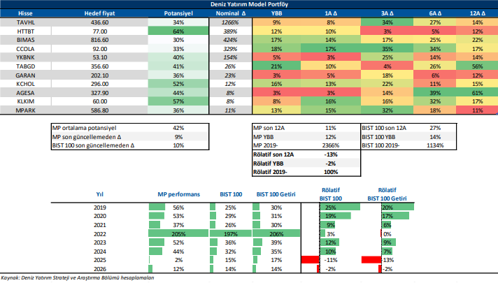 Deniz Yatırım Model Portföy, Deniz Yatırım Strateji ve Araştırma Bölümü tarafından, temel analiz kriterlerine göre hazırlanmış, orta-uzun vadeli hisse senedi tavsiye listesidir. Alınan pozisyonlar sadece uzun yönlüdür (long only). Herhangi bir rakamsal/yüzdesel getiri hedefi söz konusu değildir. Herhangi bir şirket sayısı sınırı söz konusu değildir. Herhangi bir sıklıkta/takvim dahilinde değişiklik yapma zorunluluğu söz konusu değildir. Strateji ve Araştırma Bölümü analistleri portföyü takvim yılı içerisinde piyasa koşulları izin vermez ise değiştirmeme hakkına sahiptirler. Portföy içerisinde yer alan şirketler için temel analiz açısından getiri potansiyeli kalmamış dahi olsa da (değerleme olarak) şirket markasına olan geçmiş ve gelecek dönem güveni ile liste içerisinde kalmaya devam edebilirler. Portföyde yer alan şirketler için AL tavsiyesi bulunması zorunluluğu söz konusu değildir. Bölüm analistleri, TUT ve/veya Gözden Geçiriliyor önerileri ile de liste içerisinde şirket tercihinde bulunabilirler.