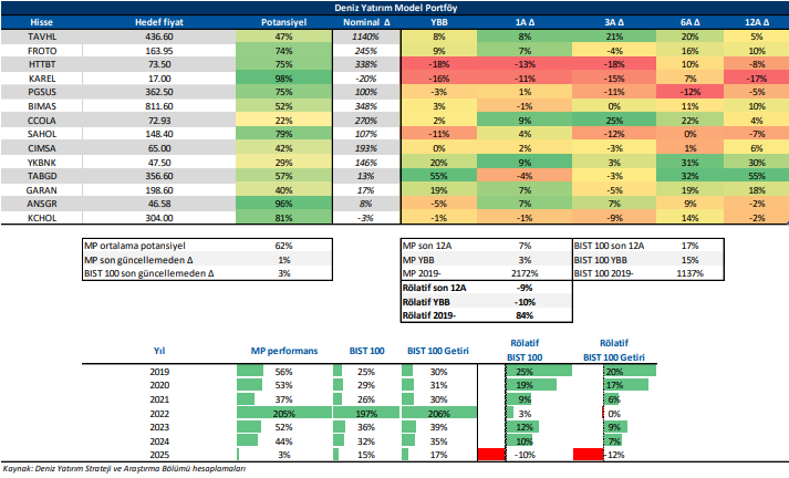 Deniz Yatırım Model Portföy, Deniz Yatırım Strateji ve Araştırma Bölümü tarafından, temel analiz kriterlerine göre hazırlanmış, orta-uzun vadeli hisse senedi tavsiye listesidir. Alınan pozisyonlar sadece uzun yönlüdür (long only). Herhangi bir rakamsal/yüzdesel getiri hedefi söz konusu değildir. Herhangi bir şirket sayısı sınırı söz konusu değildir. Herhangi bir sıklıkta/takvim dahilinde değişiklik yapma zorunluluğu söz konusu değildir. Strateji ve Araştırma Bölümü analistleri portföyü takvim yılı içerisinde piyasa koşulları izin vermez ise değiştirmeme hakkına sahiptirler. Portföy içerisinde yer alan şirketler için temel analiz açısından getiri potansiyeli kalmamış dahi olsa da (değerleme olarak) şirket markasına olan geçmiş ve gelecek dönem güveni ile liste içerisinde kalmaya devam edebilirler. Portföyde yer alan şirketler için AL tavsiyesi bulunması zorunluluğu söz konusu değildir. Bölüm analistleri, TUT ve/veya Gözden Geçiriliyor önerileri ile de liste içerisinde şirket tercihinde bulunabilirler.
