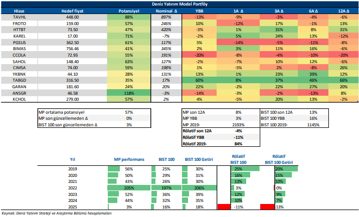 Deniz Yatırım Model Portföy, Deniz Yatırım Strateji ve Araştırma Bölümü tarafından, temel analiz kriterlerine göre hazırlanmış, orta-uzun vadeli hisse senedi tavsiye listesidir. Alınan pozisyonlar sadece uzun yönlüdür (long only). Herhangi bir rakamsal/yüzdesel getiri hedefi söz konusu değildir. Herhangi bir şirket sayısı sınırı söz konusu değildir. Herhangi bir sıklıkta/takvim dahilinde değişiklik yapma zorunluluğu söz konusu değildir. Strateji ve Araştırma Bölümü analistleri portföyü takvim yılı içerisinde piyasa koşulları izin vermez ise değiştirmeme hakkına sahiptirler. Portföy içerisinde yer alan şirketler için temel analiz açısından getiri potansiyeli kalmamış dahi olsa da (değerleme olarak) şirket markasına olan geçmiş ve gelecek dönem güveni ile liste içerisinde kalmaya devam edebilirler. Portföyde yer alan şirketler için AL tavsiyesi bulunması zorunluluğu söz konusu değildir. Bölüm analistleri, TUT ve/veya Gözden Geçiriliyor önerileri ile de liste içerisinde şirket tercihinde bulunabilirler.