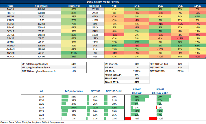 Deniz Yatırım Model Portföy, Deniz Yatırım Strateji ve Araştırma Bölümü tarafından, temel analiz kriterlerine göre hazırlanmış, orta-uzun vadeli hisse senedi tavsiye listesidir. Alınan pozisyonlar sadece uzun yönlüdür (long only). Herhangi bir rakamsal/yüzdesel getiri hedefi söz konusu değildir. Herhangi bir şirket sayısı sınırı söz konusu değildir. Herhangi bir sıklıkta/takvim dahilinde değişiklik yapma zorunluluğu söz konusu değildir. Strateji ve Araştırma Bölümü analistleri portföyü takvim yılı içerisinde piyasa koşulları izin vermez ise değiştirmeme hakkına sahiptirler. Portföy içerisinde yer alan şirketler için temel analiz açısından getiri potansiyeli kalmamış dahi olsa da (değerleme olarak) şirket markasına olan geçmiş ve gelecek dönem güveni ile liste içerisinde kalmaya devam edebilirler. Portföyde yer alan şirketler için AL tavsiyesi bulunması zorunluluğu söz konusu değildir. Bölüm analistleri, TUT ve/veya Gözden Geçiriliyor önerileri ile de liste içerisinde şirket tercihinde bulunabilirler.