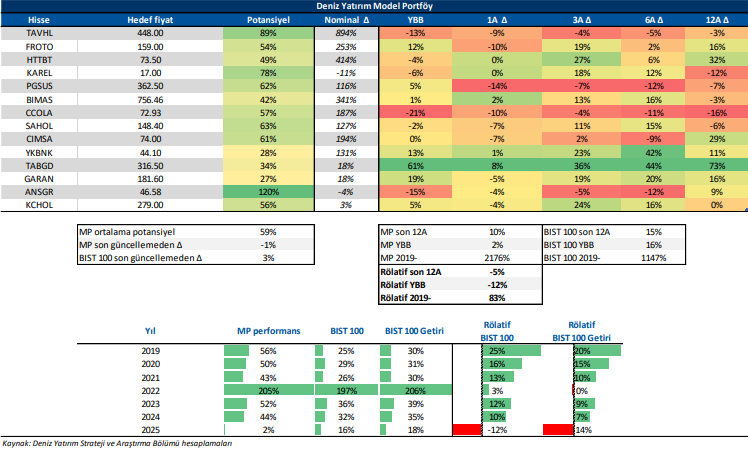 Deniz Yatırım Model Portföy, Deniz Yatırım Strateji ve Araştırma Bölümü tarafından, temel analiz kriterlerine göre hazırlanmış, orta-uzun vadeli hisse senedi tavsiye listesidir. Alınan pozisyonlar sadece uzun yönlüdür (long only). Herhangi bir rakamsal/yüzdesel getiri hedefi söz konusu değildir. Herhangi bir şirket sayısı sınırı söz konusu değildir. Herhangi bir sıklıkta/takvim dahilinde değişiklik yapma zorunluluğu söz konusu değildir. Strateji ve Araştırma Bölümü analistleri portföyü takvim yılı içerisinde piyasa koşulları izin vermez ise değiştirmeme hakkına sahiptirler. Portföy içerisinde yer alan şirketler için temel analiz açısından getiri potansiyeli kalmamış dahi olsa da (değerleme olarak) şirket markasına olan geçmiş ve gelecek dönem güveni ile liste içerisinde kalmaya devam edebilirler. Portföyde yer alan şirketler için AL tavsiyesi bulunması zorunluluğu söz konusu değildir. Bölüm analistleri, TUT ve/veya Gözden Geçiriliyor önerileri ile de liste içerisinde şirket tercihinde bulunabilirler.
