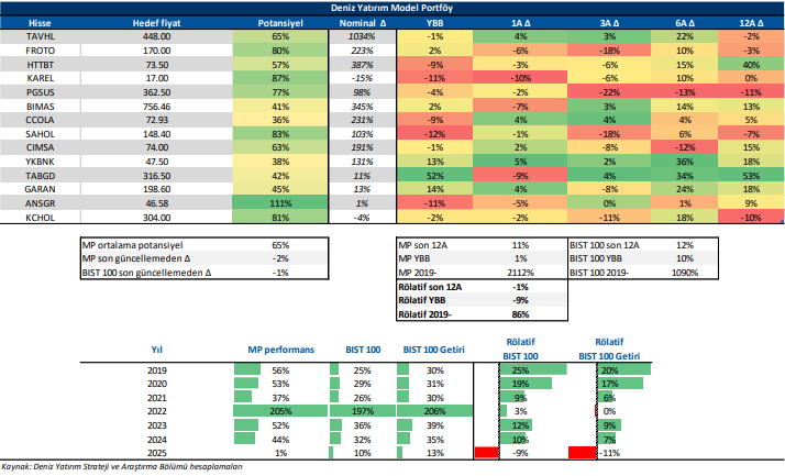 Deniz Yatırım Model Portföy, Deniz Yatırım Strateji ve Araştırma Bölümü tarafından, temel analiz kriterlerine göre hazırlanmış, orta-uzun vadeli hisse senedi tavsiye listesidir. Alınan pozisyonlar sadece uzun yönlüdür (long only). Herhangi bir rakamsal/yüzdesel getiri hedefi söz konusu değildir. Herhangi bir şirket sayısı sınırı söz konusu değildir. Herhangi bir sıklıkta/takvim dahilinde değişiklik yapma zorunluluğu söz konusu değildir. Strateji ve Araştırma Bölümü analistleri portföyü takvim yılı içerisinde piyasa koşulları izin vermez ise değiştirmeme hakkına sahiptirler. Portföy içerisinde yer alan şirketler için temel analiz açısından getiri potansiyeli kalmamış dahi olsa da (değerleme olarak) şirket markasına olan geçmiş ve gelecek dönem güveni ile liste içerisinde kalmaya devam edebilirler. Portföyde yer alan şirketler için AL tavsiyesi bulunması zorunluluğu söz konusu değildir. Bölüm analistleri, TUT ve/veya Gözden Geçiriliyor önerileri ile de liste içerisinde şirket tercihinde bulunabilirler.