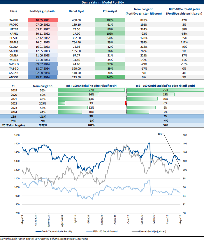 Deniz Yatırım Model Portföy, Deniz Yatırım Strateji ve Araştırma Bölümü tarafından, temel analiz kriterlerine göre hazırlanmış, orta-uzun vadeli hisse senedi tavsiye listesidir. Alınan pozisyonlar sadece uzun yönlüdür (long only). Herhangi bir rakamsal/yüzdesel getiri hedefi söz konusu değildir. Herhangi bir şirket sayısı sınırı söz konusu değildir. Herhangi bir sıklıkta/takvim dahilinde değişiklik yapma zorunluluğu söz konusu değildir. Strateji ve Araştırma Bölümü analistleri portföyü takvim yılı içerisinde piyasa koşulları izin vermez ise değiştirmeme hakkına sahiptirler. Portföy içerisinde yer alan şirketler için temel analiz açısından getiri potansiyeli kalmamış dahi olsa da (değerleme olarak) şirket markasına olan geçmiş ve gelecek dönem güveni ile liste içerisinde kalmaya devam edebilirler. Portföyde yer alan şirketler için AL tavsiyesi bulunması zorunluluğu söz konusu değildir. Bölüm analistleri, TUT ve/veya Gözden Geçiriliyor önerileri ile de liste içerisinde şirket tercihinde bulunabilirler.