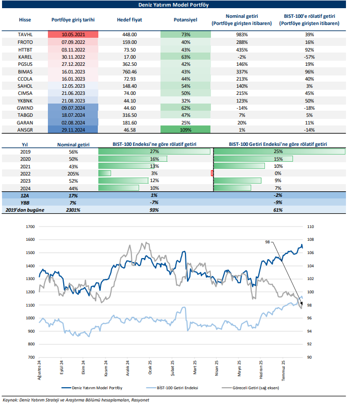 Deniz Yatırım Model Portföy, Deniz Yatırım Strateji ve Araştırma Bölümü tarafından, temel analiz kriterlerine göre hazırlanmış, orta-uzun vadeli hisse senedi tavsiye listesidir. Alınan pozisyonlar sadece uzun yönlüdür (long only). Herhangi bir rakamsal/yüzdesel getiri hedefi söz konusu değildir. Herhangi bir şirket sayısı sınırı söz konusu değildir. Herhangi bir sıklıkta/takvim dahilinde değişiklik yapma zorunluluğu söz konusu değildir. Strateji ve Araştırma Bölümü analistleri portföyü takvim yılı içerisinde piyasa koşulları izin vermez ise değiştirmeme hakkına sahiptirler. Portföy içerisinde yer alan şirketler için temel analiz açısından getiri potansiyeli kalmamış dahi olsa da (değerleme olarak) şirket markasına olan geçmiş ve gelecek dönem güveni ile liste içerisinde kalmaya devam edebilirler. Portföyde yer alan şirketler için AL tavsiyesi bulunması zorunluluğu söz konusu değildir. Bölüm analistleri, TUT ve/veya Gözden Geçiriliyor önerileri ile de liste içerisinde şirket tercihinde bulunabilirler.
