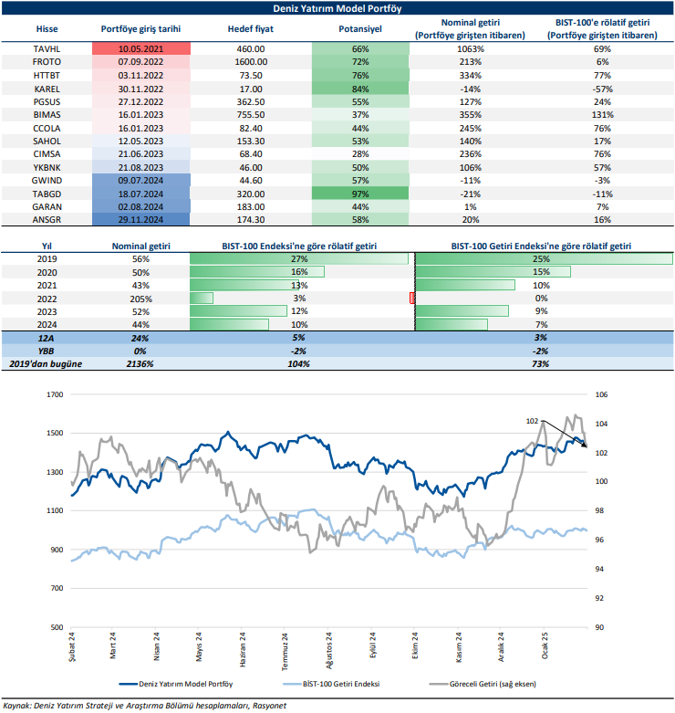 Deniz Yatırım Model Portföy, Deniz Yatırım Strateji ve Araştırma Bölümü tarafından, temel analiz kriterlerine göre hazırlanmış, orta-uzun vadeli hisse senedi tavsiye listesidir. Alınan pozisyonlar sadece uzun yönlüdür (long only). Herhangi bir rakamsal/yüzdesel getiri hedefi söz konusu değildir. Herhangi bir şirket sayısı sınırı söz konusu değildir. Herhangi bir sıklıkta/takvim dahilinde değişiklik yapma zorunluluğu söz konusu değildir. Strateji ve Araştırma Bölümü analistleri portföyü takvim yılı içerisinde piyasa koşulları izin vermez ise değiştirmeme hakkına sahiptirler. Portföy içerisinde yer alan şirketler için temel analiz açısından getiri potansiyeli kalmamış dahi olsa da (değerleme olarak) şirket markasına olan geçmiş ve gelecek dönem güveni ile liste içerisinde kalmaya devam edebilirler. Portföyde yer alan şirketler için AL tavsiyesi bulunması zorunluluğu söz konusu değildir. Bölüm analistleri, TUT ve/veya Gözden Geçiriliyor önerileri ile de liste içerisinde şirket tercihinde bulunabilirler.