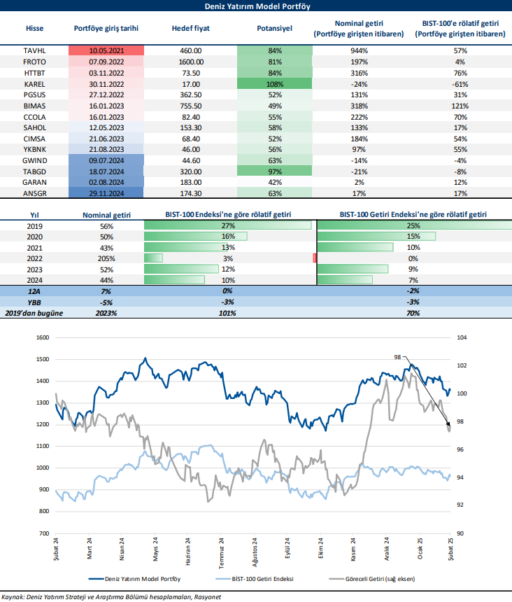 Deniz Yatırım Model Portföy, Deniz Yatırım Strateji ve Araştırma Bölümü tarafından, temel analiz kriterlerine göre hazırlanmış, orta-uzun vadeli hisse senedi tavsiye listesidir. Alınan pozisyonlar sadece uzun yönlüdür (long only). Herhangi bir rakamsal/yüzdesel getiri hedefi söz konusu değildir. Herhangi bir şirket sayısı sınırı söz konusu değildir. Herhangi bir sıklıkta/takvim dahilinde değişiklik yapma zorunluluğu söz konusu değildir. Strateji ve Araştırma Bölümü analistleri portföyü takvim yılı içerisinde piyasa koşulları izin vermez ise değiştirmeme hakkına sahiptirler. Portföy içerisinde yer alan şirketler için temel analiz açısından getiri potansiyeli kalmamış dahi olsa da (değerleme olarak) şirket markasına olan geçmiş ve gelecek dönem güveni ile liste içerisinde kalmaya devam edebilirler. Portföyde yer alan şirketler için AL tavsiyesi bulunması zorunluluğu söz konusu değildir. Bölüm analistleri, TUT ve/veya Gözden Geçiriliyor önerileri ile de liste içerisinde şirket tercihinde bulunabilirler.