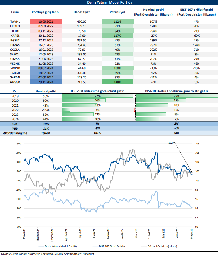 Deniz Yatırım Model Portföy, Deniz Yatırım Strateji ve Araştırma Bölümü tarafından, temel analiz kriterlerine göre hazırlanmış, orta-uzun vadeli hisse senedi tavsiye listesidir. Alınan pozisyonlar sadece uzun yönlüdür (long only). Herhangi bir rakamsal/yüzdesel getiri hedefi söz konusu değildir. Herhangi bir şirket sayısı sınırı söz konusu değildir. Herhangi bir sıklıkta/takvim dahilinde değişiklik yapma zorunluluğu söz konusu değildir. Strateji ve Araştırma Bölümü analistleri portföyü takvim yılı içerisinde piyasa koşulları izin vermez ise değiştirmeme hakkına sahiptirler. Portföy içerisinde yer alan şirketler için temel analiz açısından getiri potansiyeli kalmamış dahi olsa da (değerleme olarak) şirket markasına olan geçmiş ve gelecek dönem güveni ile liste içerisinde kalmaya devam edebilirler. Portföyde yer alan şirketler için AL tavsiyesi bulunması zorunluluğu söz konusu değildir. Bölüm analistleri, TUT ve/veya Gözden Geçiriliyor önerileri ile de liste içerisinde şirket tercihinde bulunabilirler.